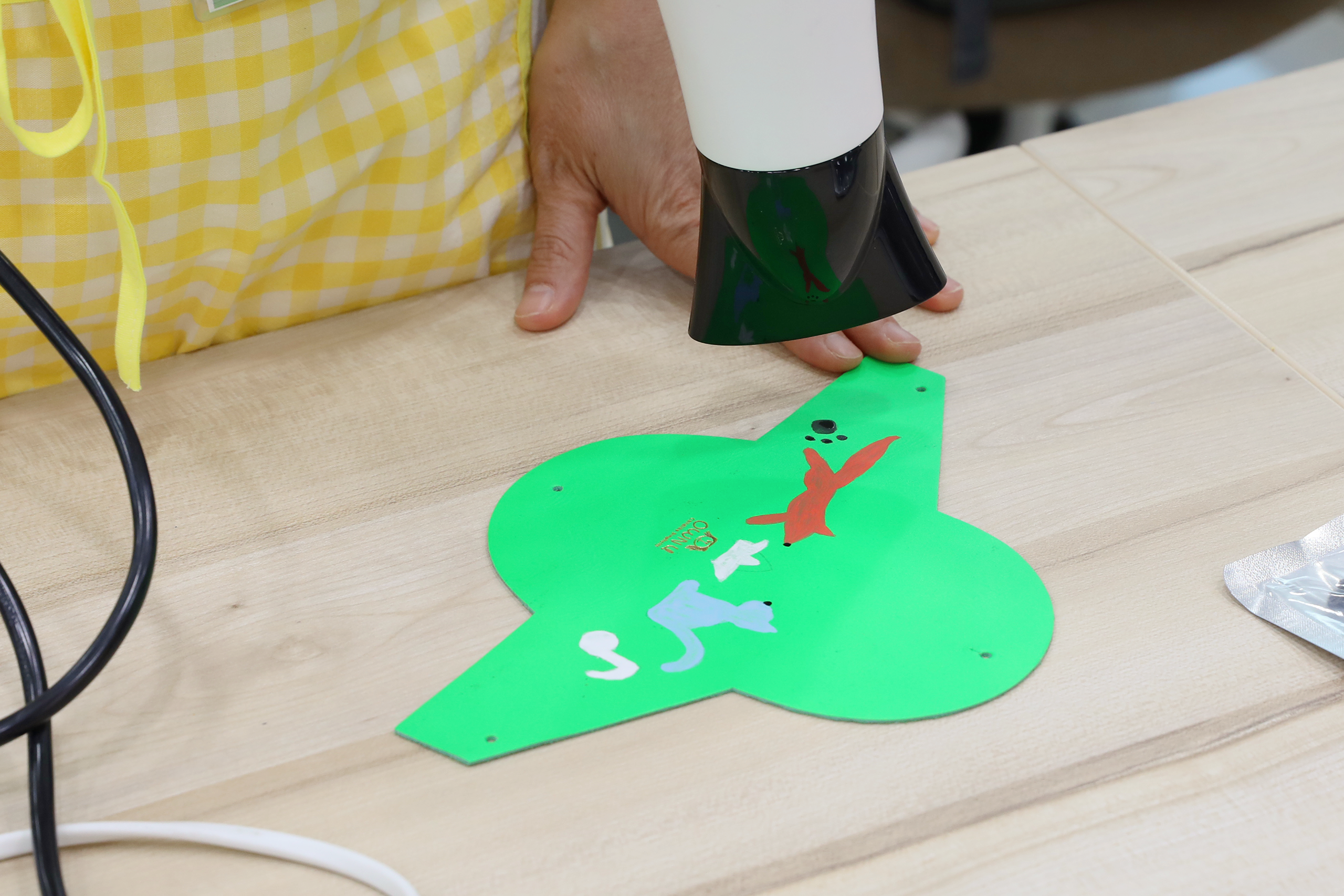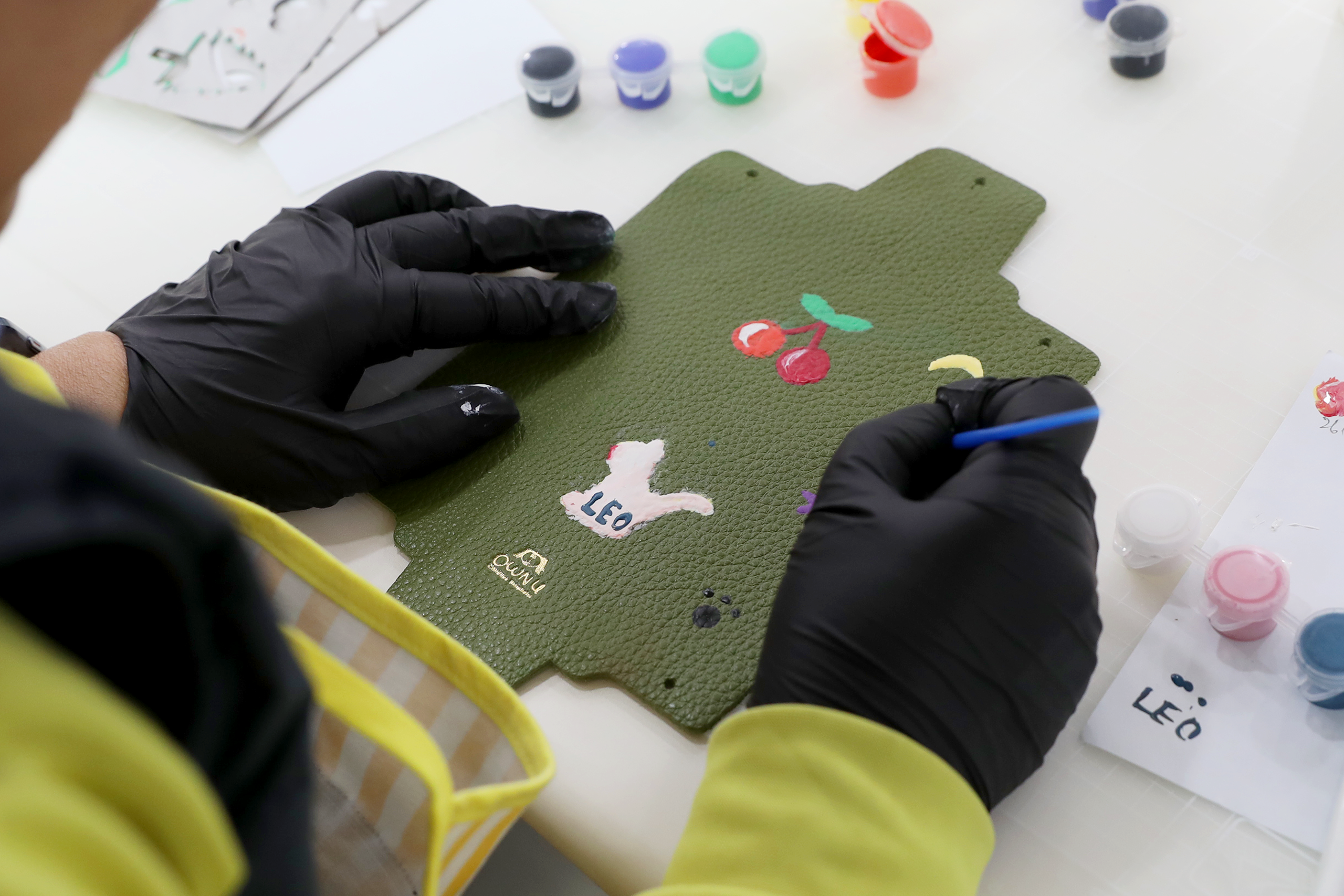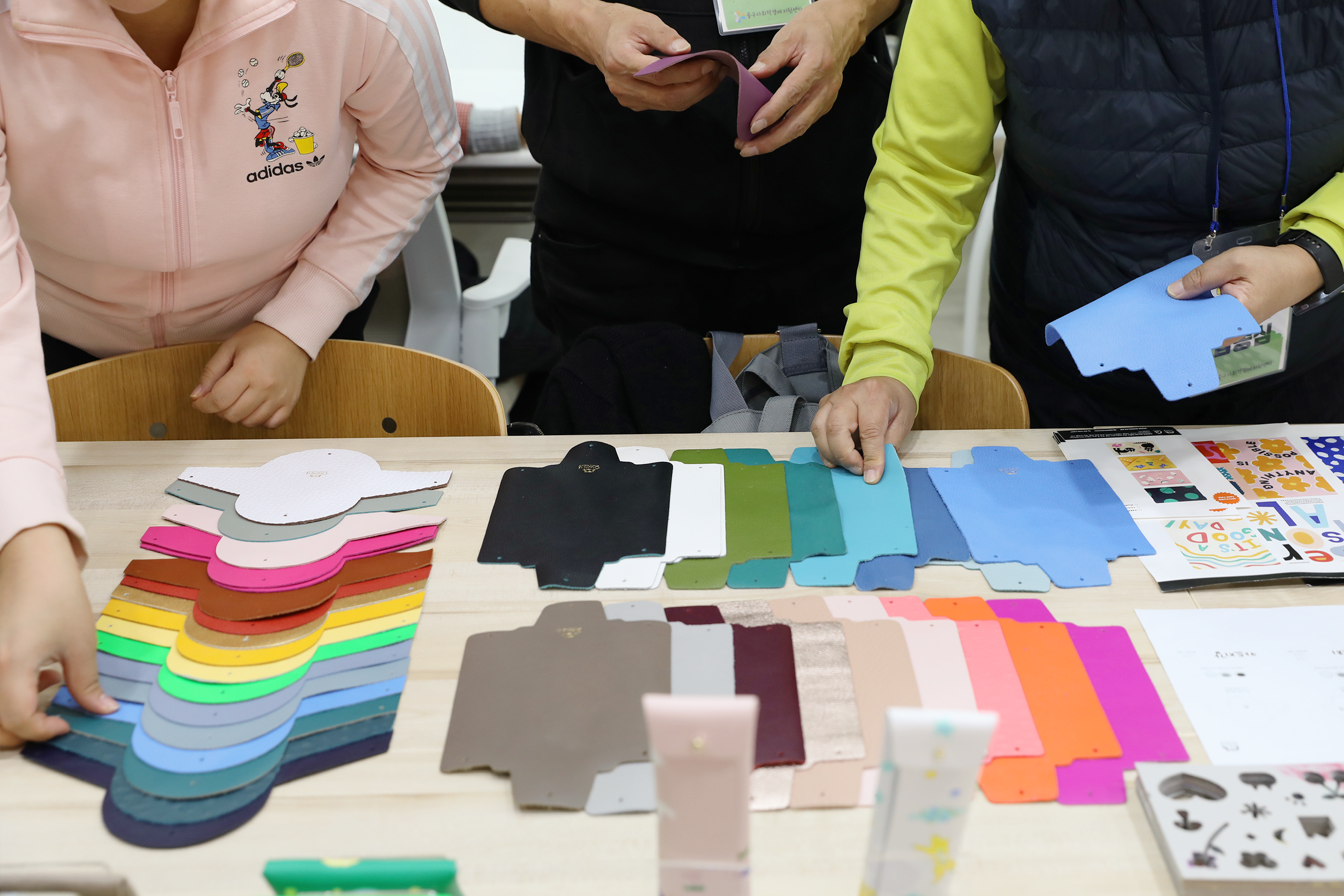 환경 교육 강의 후, 가죽 재단물의 색상을 고르고