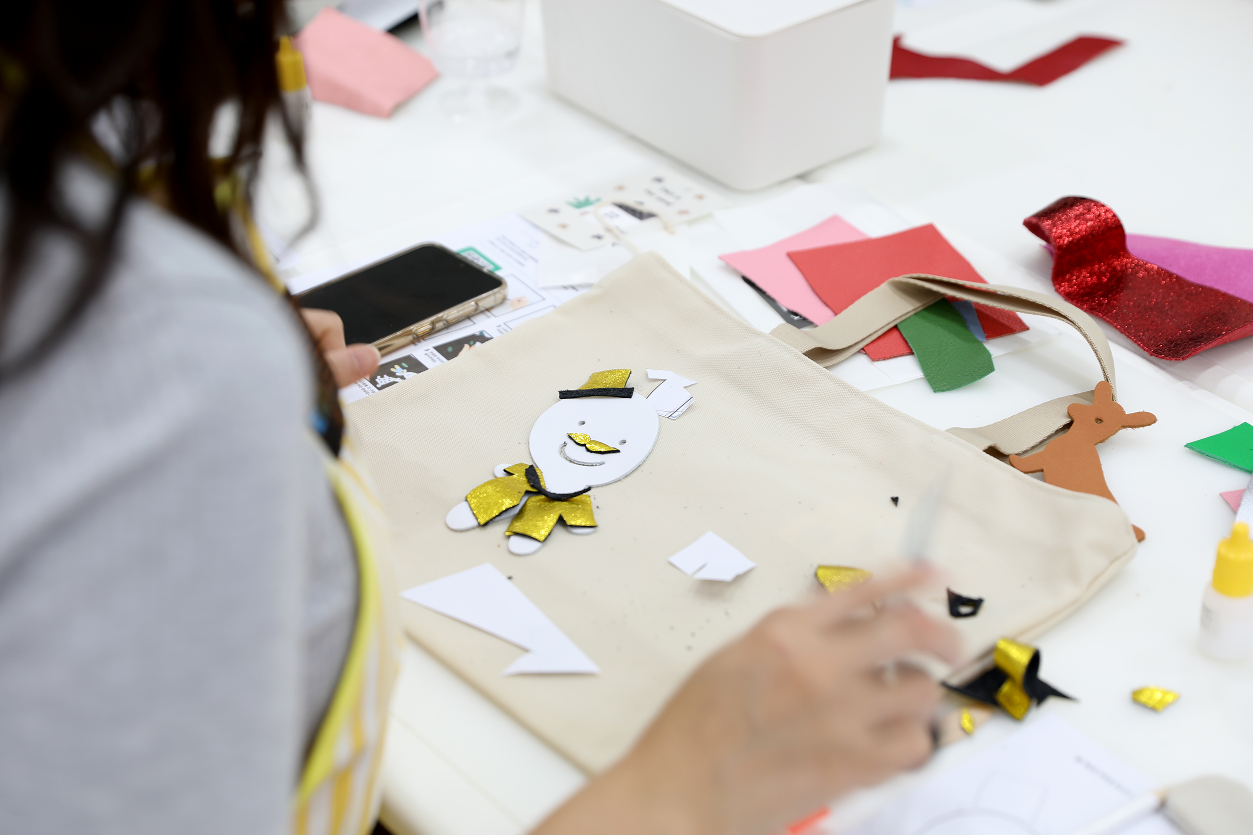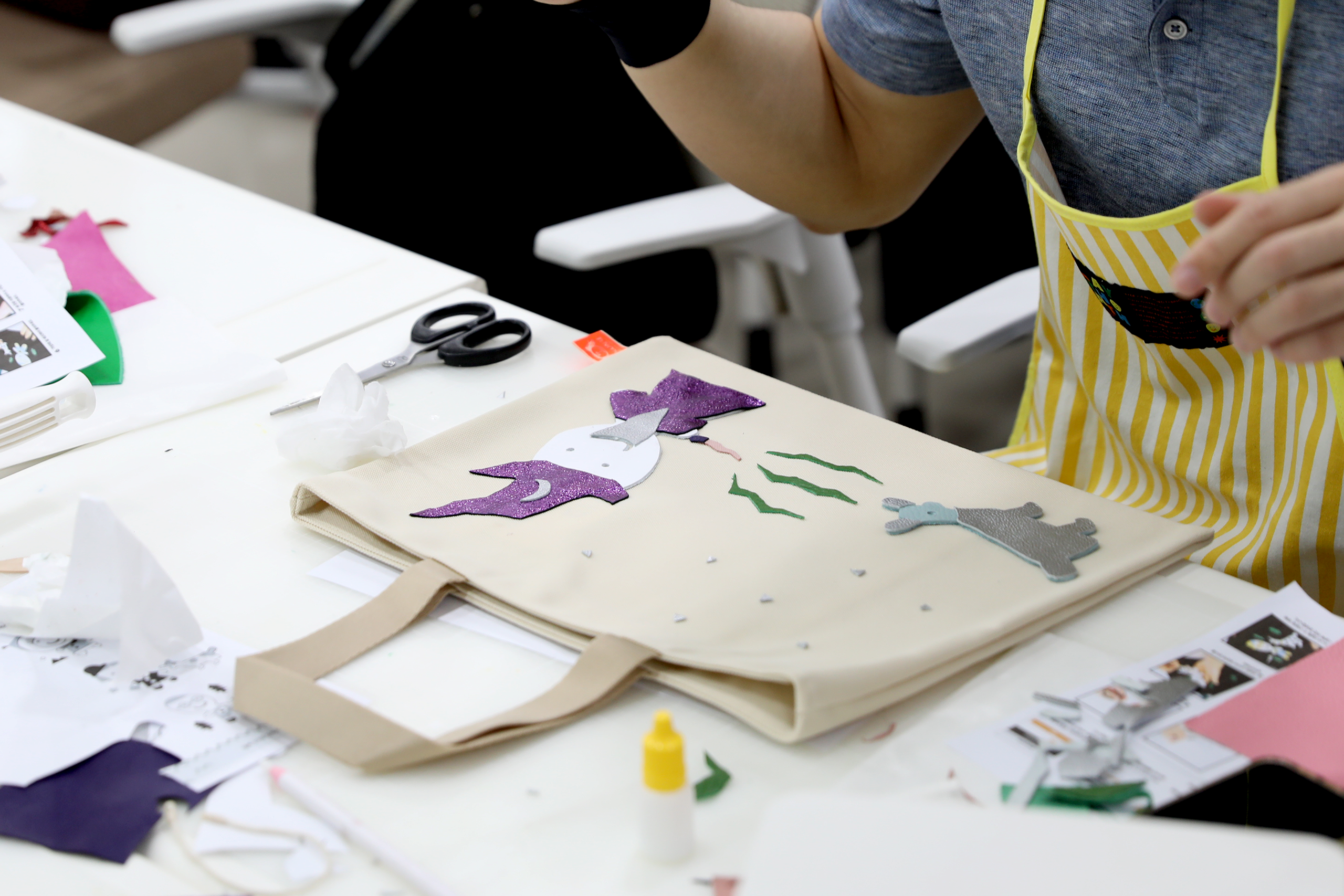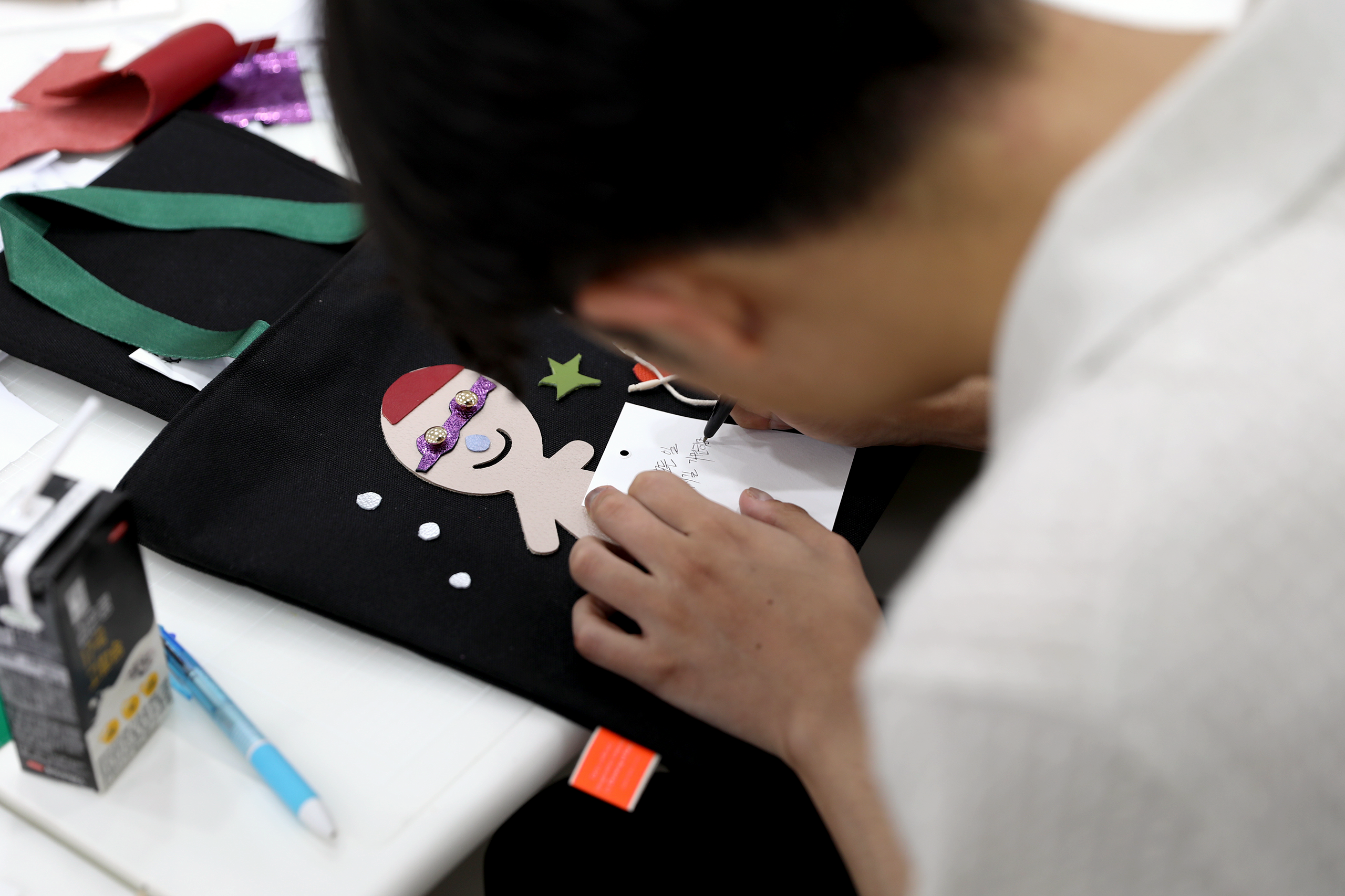 환경 교육 강의 후 자투리 가죽으로 가방을 장식하여 완성합니다.