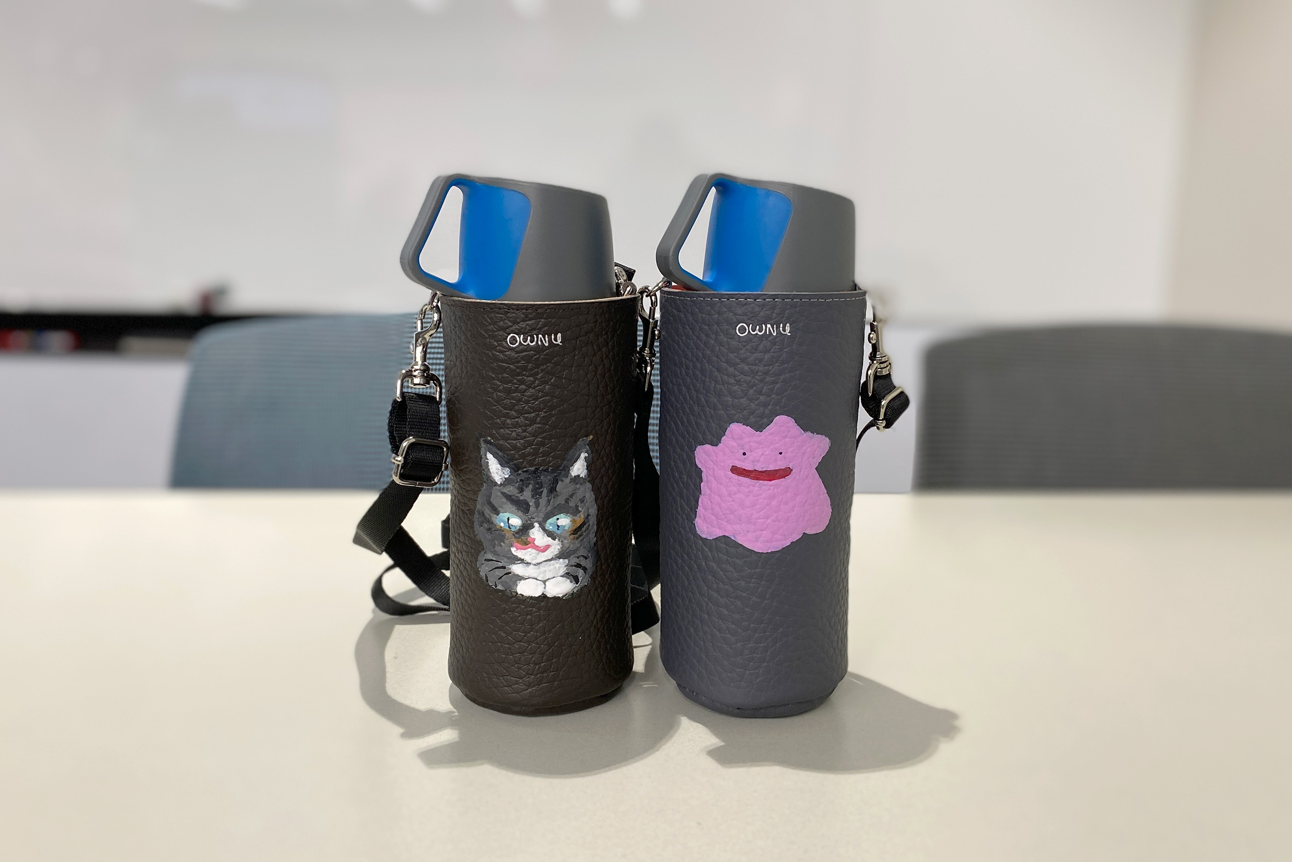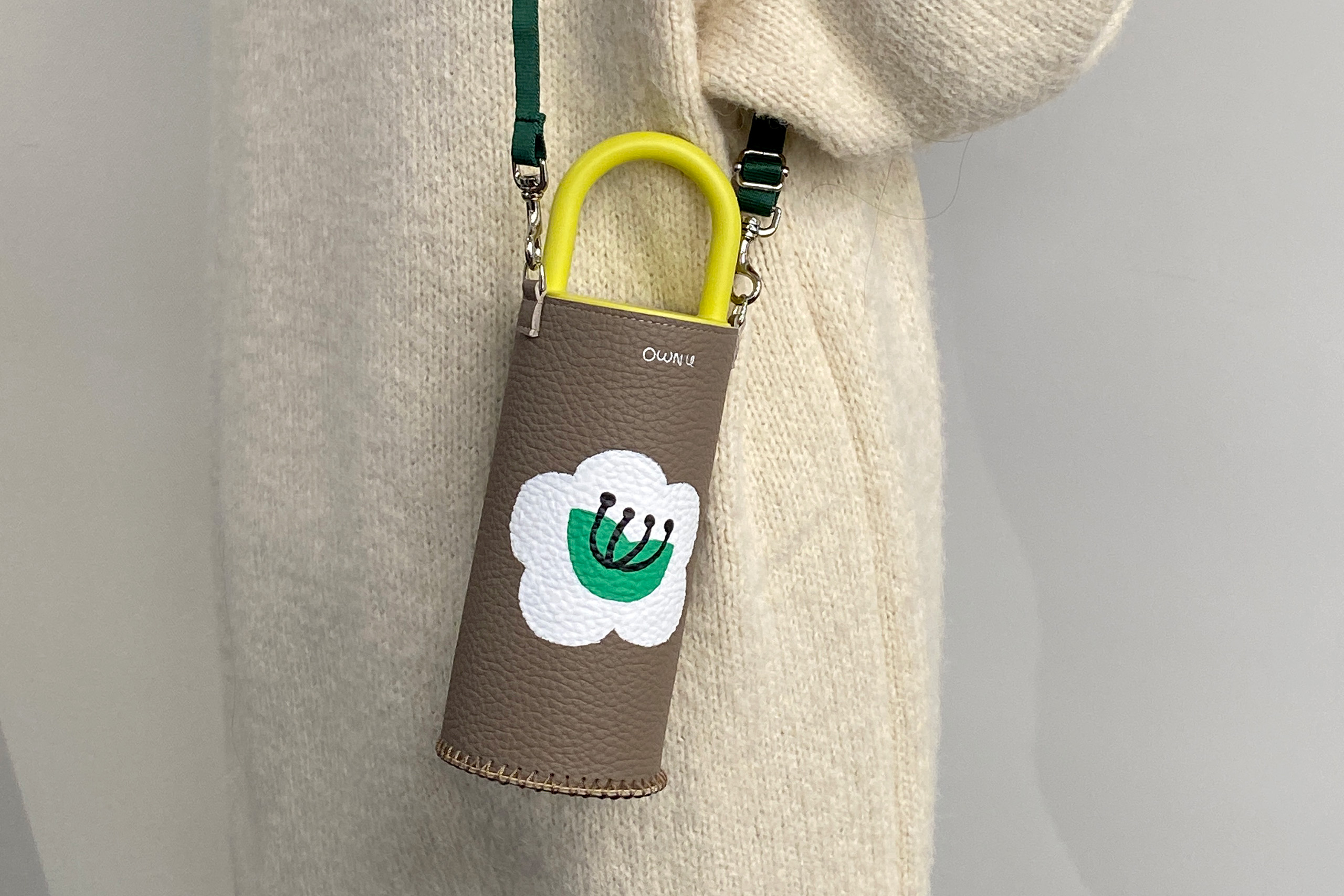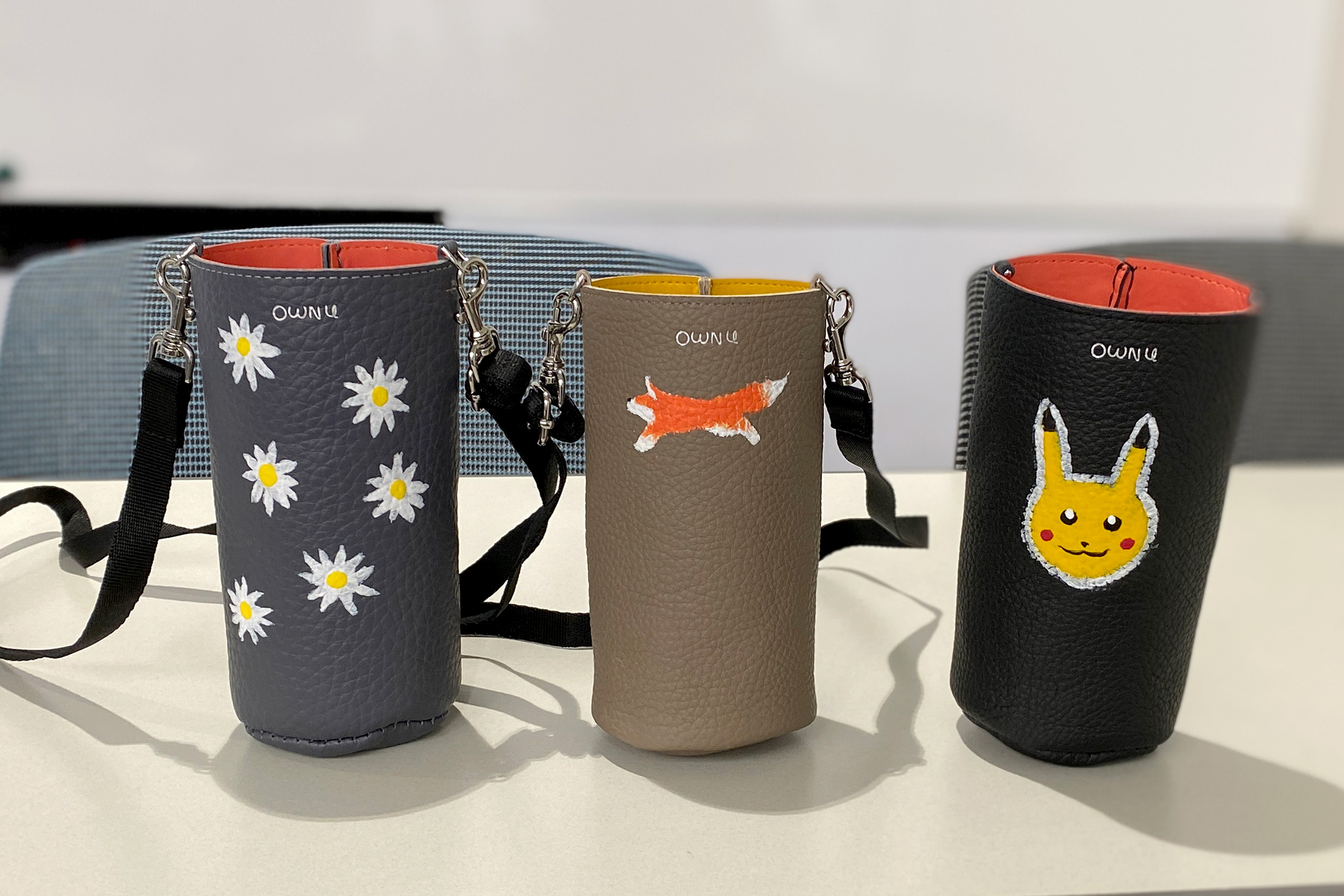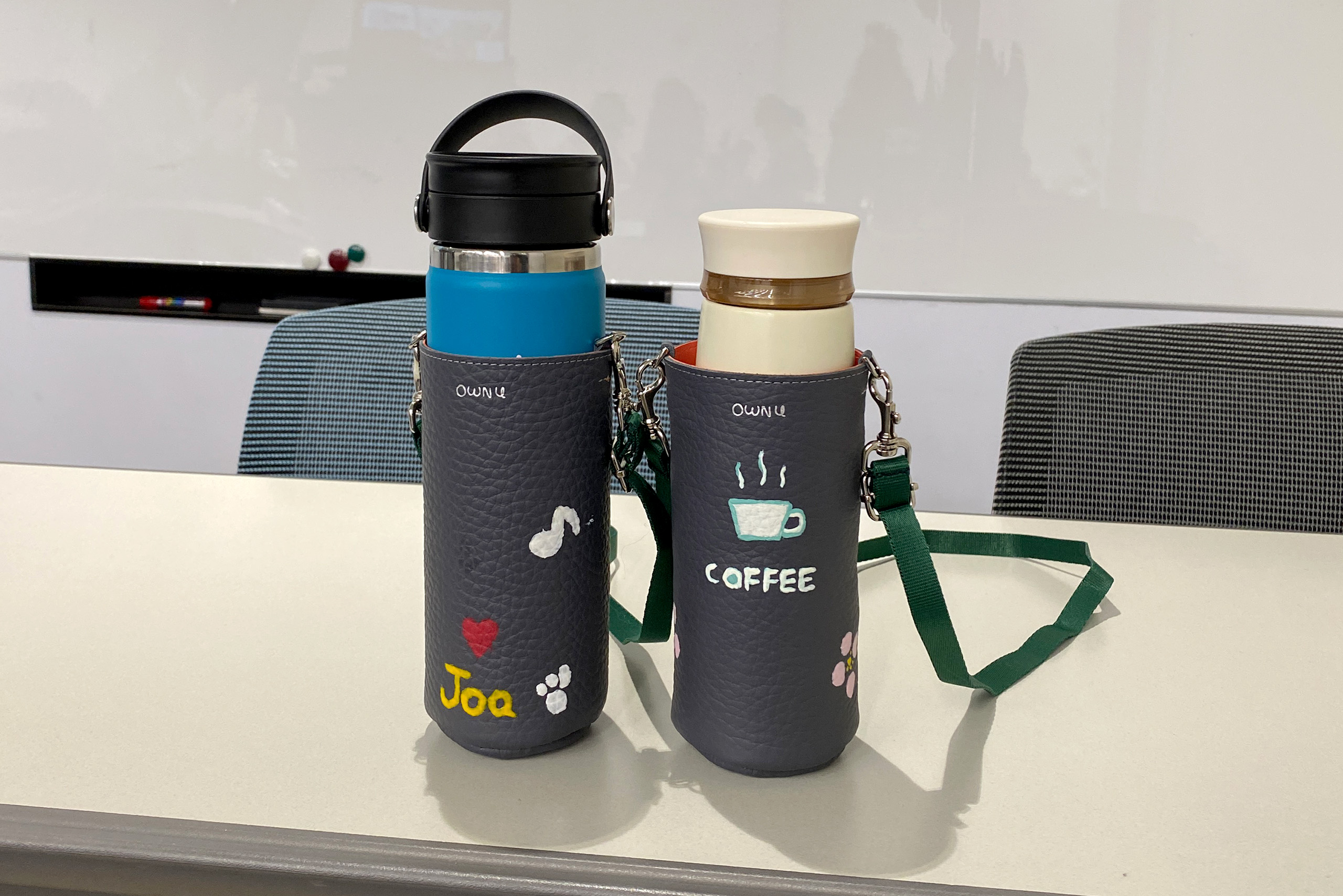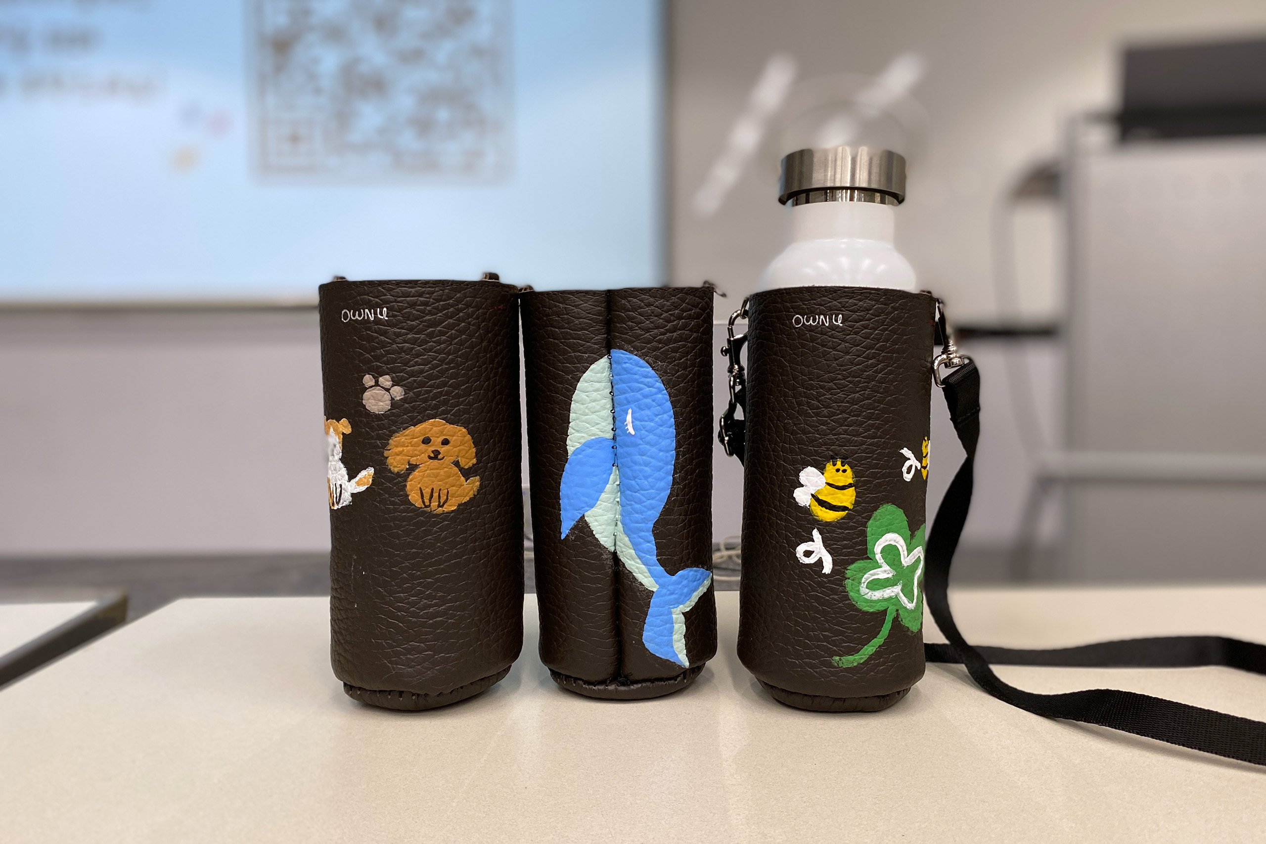 고급 소파 제작 후 버려지는 자투리 가죽을 활용한 텀블러백을 바느질로 조립하고,